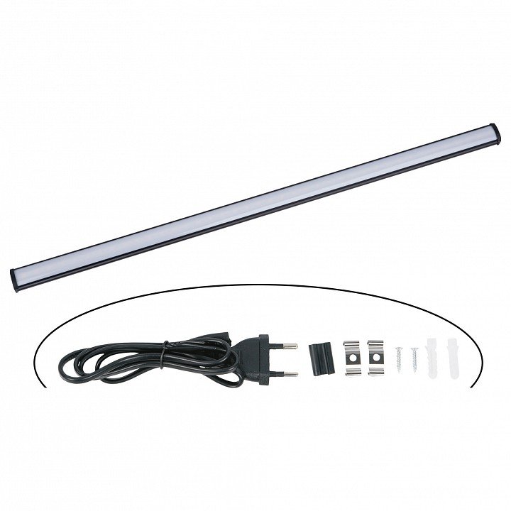 Компоненты, входящие в комплект: провод электропитания с вилкой без заземления длиной 0.9 м. коннектор жесткий. 2 клипсы. 2 дюбеля. 2 самореза