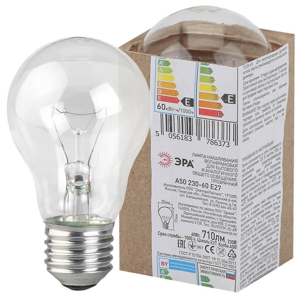 Станьте первым, кто оставит отзыв о товаре Лампа накаливания ЭРА E27 60W 2700K прозрачная A50 60-230-E27 (гофра).