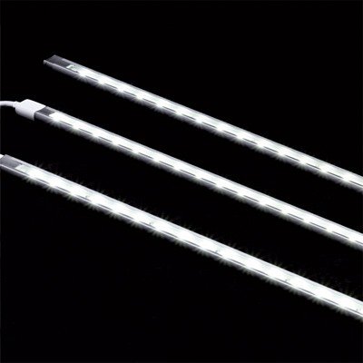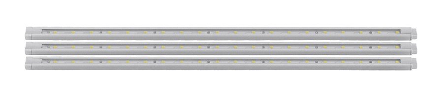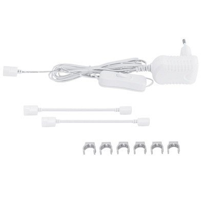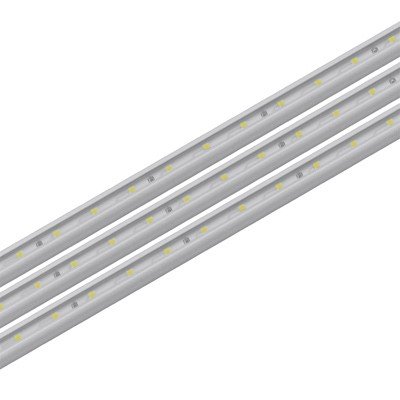 Компоненты, входящие в комплект: 3 линейки по 20 белых светодиодов длиной 390 мм (1.6 Вт). блок питания 12 В с проводом 1.8 м и выключателем на проводе. провод для соединения модуля с блоком питания длиной 1.5 м. 2 провода для соединения модулей между собой длиной 100 мм. 6 клипс для кре