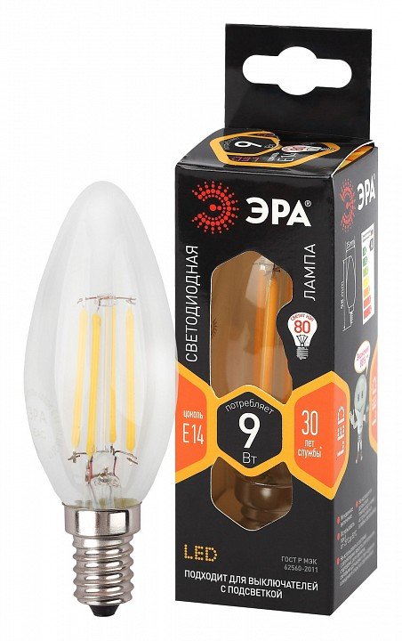 Главная Лампочки Лампа светодиодная ЭРА E14 9W 2700K прозрачная F-LED B35-9w-827-E14 Б0046991