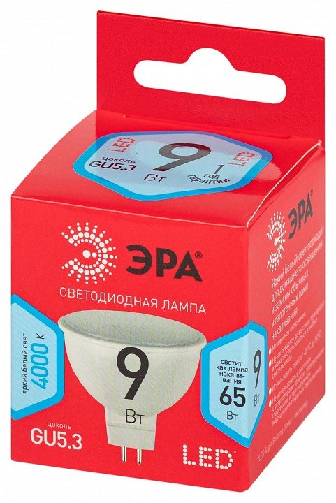 Главная Лампочки Лампа светодиодная ЭРА GU5.3 9W 4000K матовая LED MR16-9W-840-GU5.3 R Б0050199