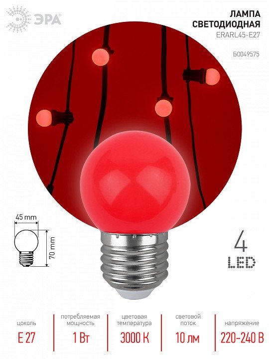 Главная Лампочки Лампа светодиодная ЭРА E27 1W 3000K красная ERARL45-E27 Б0049575