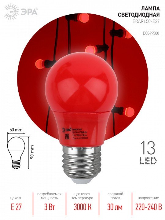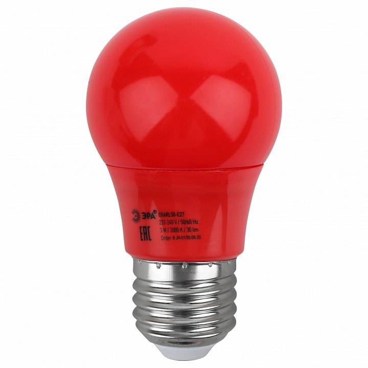 Главная Лампочки Лампа светодиодная ЭРА E27 3W 3000K красная ERARL50-E27 Б0049580