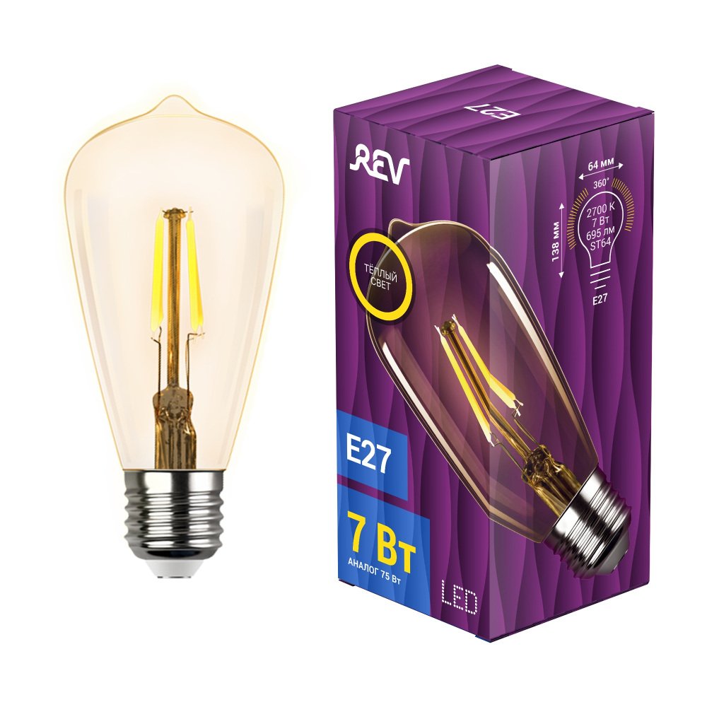 Главная Лампочки Лампа светодиодная филаментная REV VINTAGE ST64 E27 7W 2700K DECO Premium груша 32436 2