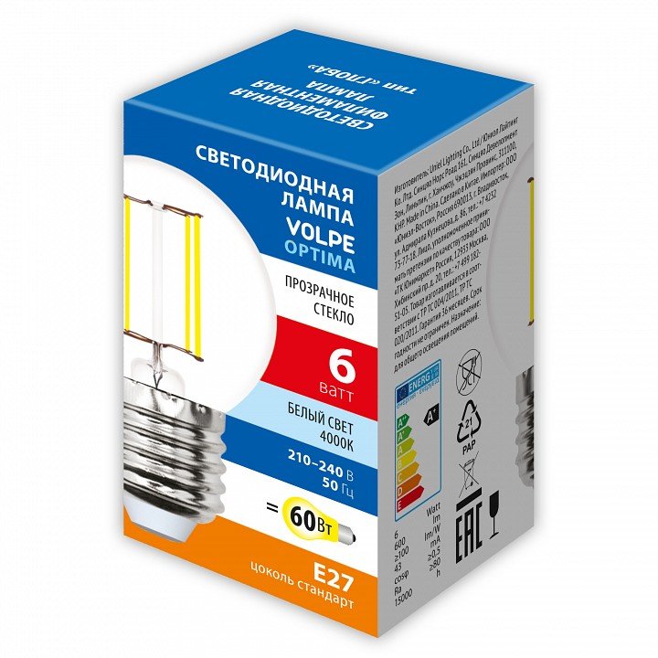 Главная Лампочки Лампа светодиодная филаментная Volpe E27 6W 4000K прозрачная LED-G45-6W/4000K/E27/CL/SLF UL-00008309