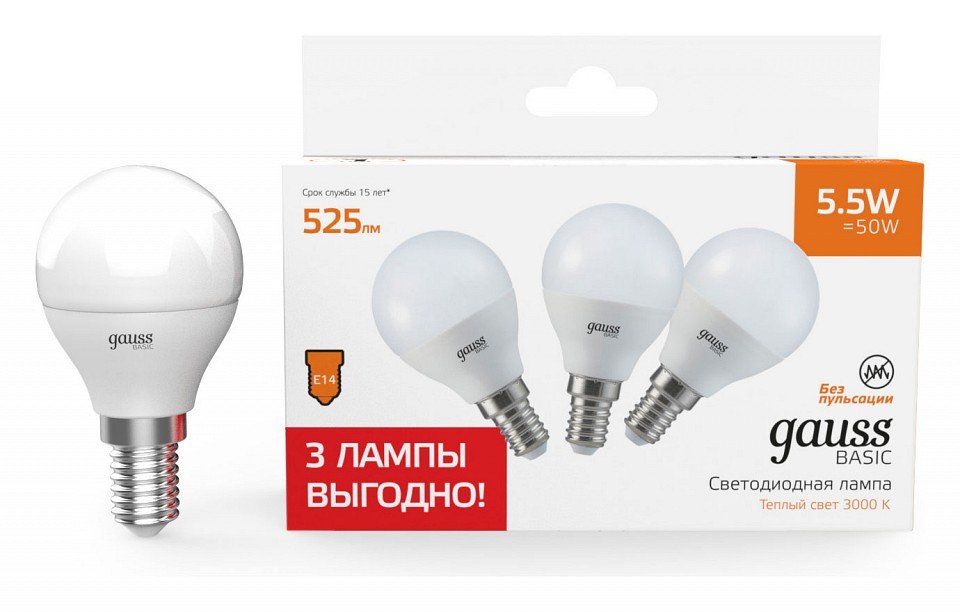 Главная Лампочки Набор ламп светодиодных Gauss Basic E14 5.5Вт 3000K 10531152T