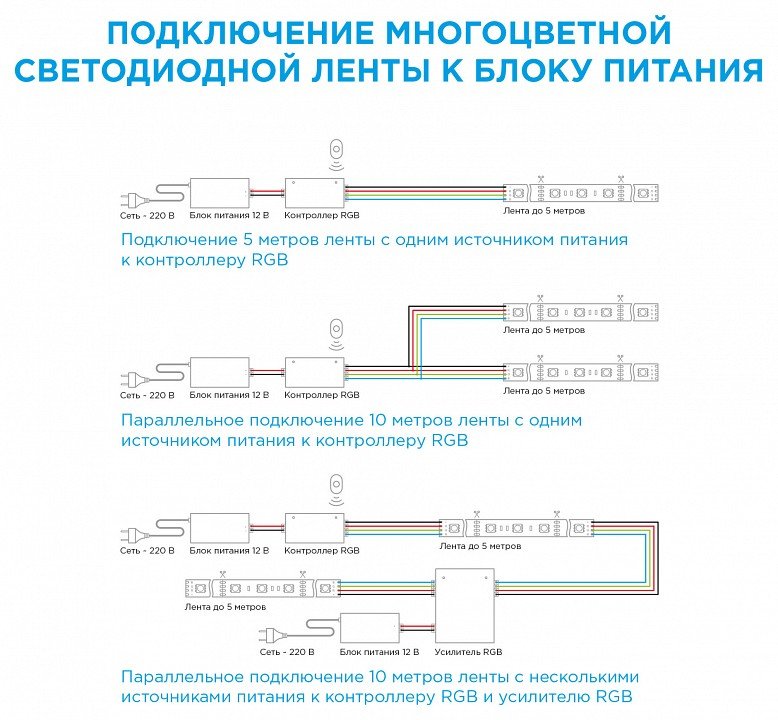 Компоненты, входящие в комплект: блок питания 12В 72Вт. контроллер для лент RGB