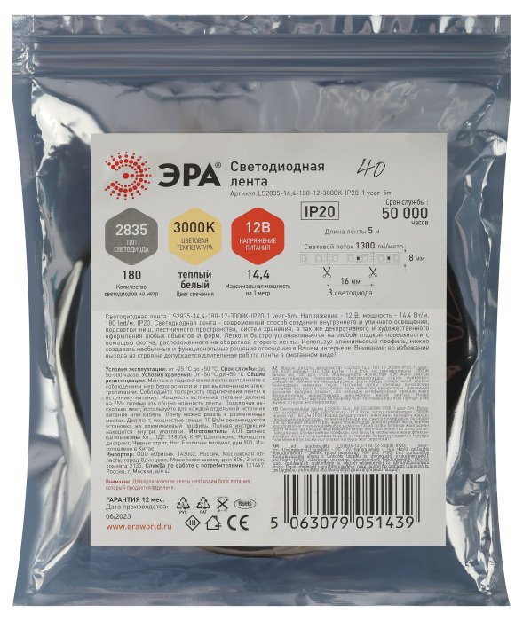 Артикул: LS2835-14,4-180-12-3000K-IP20-1 year-5m
