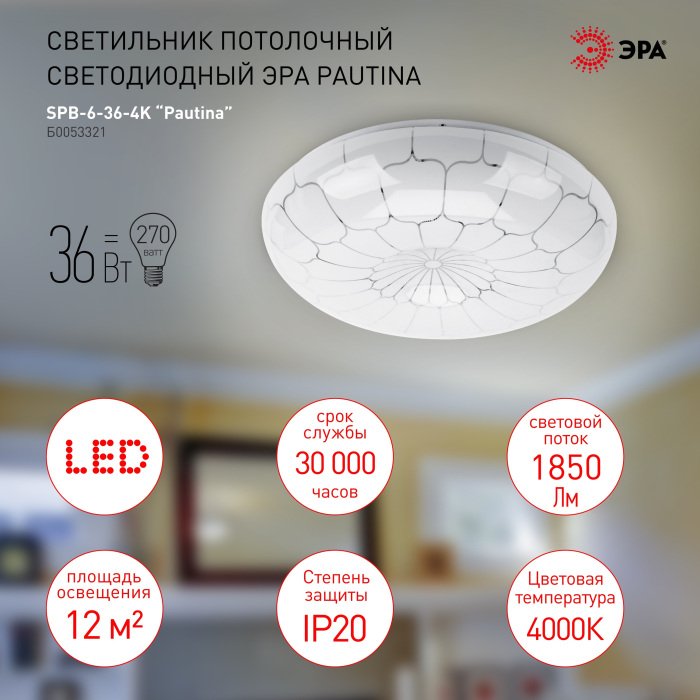Главная Люстры и потолочные светильники Потолочный светодиодный светильник ЭРА SPB-6-36-4K Pautina круглый Б0053321