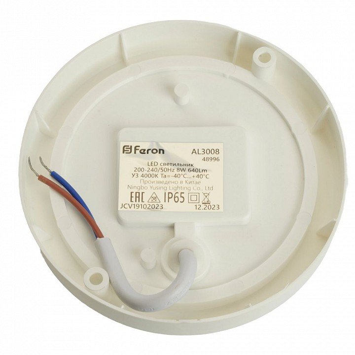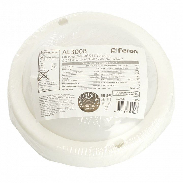 Главная Люстры и потолочные светильники Светильник светодиодный пылевлагозащищённый с оптико- акустическим датчиком Feron AL3008 в пластиковом корпусе 8W 4000K 220V IP65 белый 48996