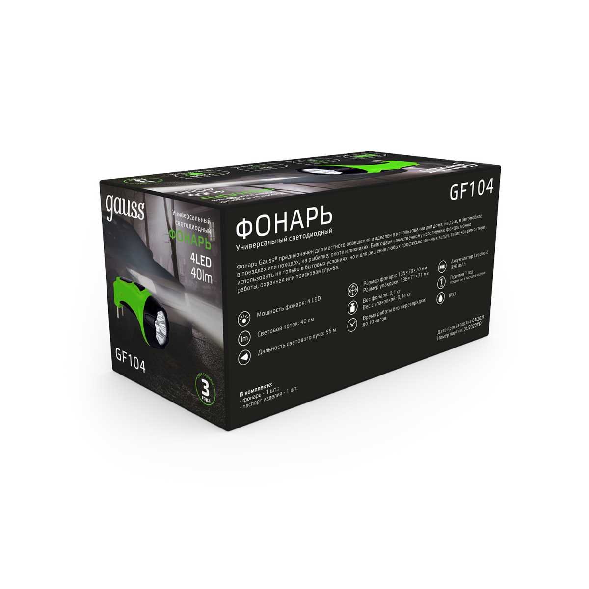 Станьте первым, кто оставит отзыв о товаре Ручной светодиодный фонарь Gauss аккумуляторный 135х70 40 лм GF104.