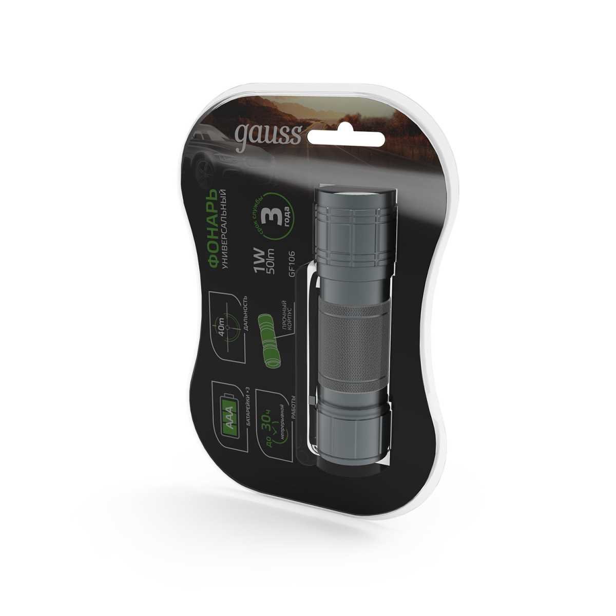 Ручной светодиодный фонарь Gauss от батареек 110х30 50 лм GF106