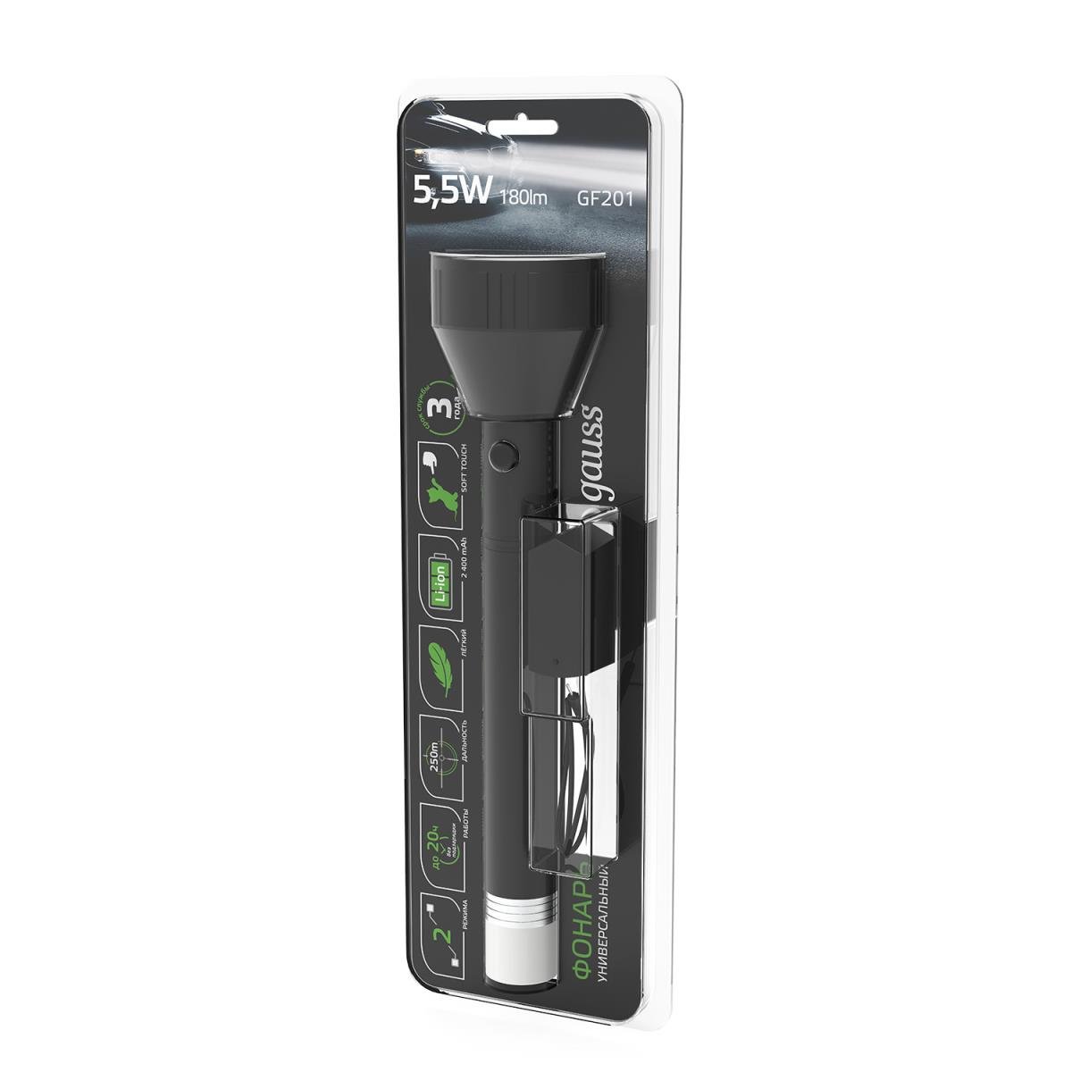 Ручной светодиодный фонарь Gauss аккумуляторный 271х63 180 лм GF201