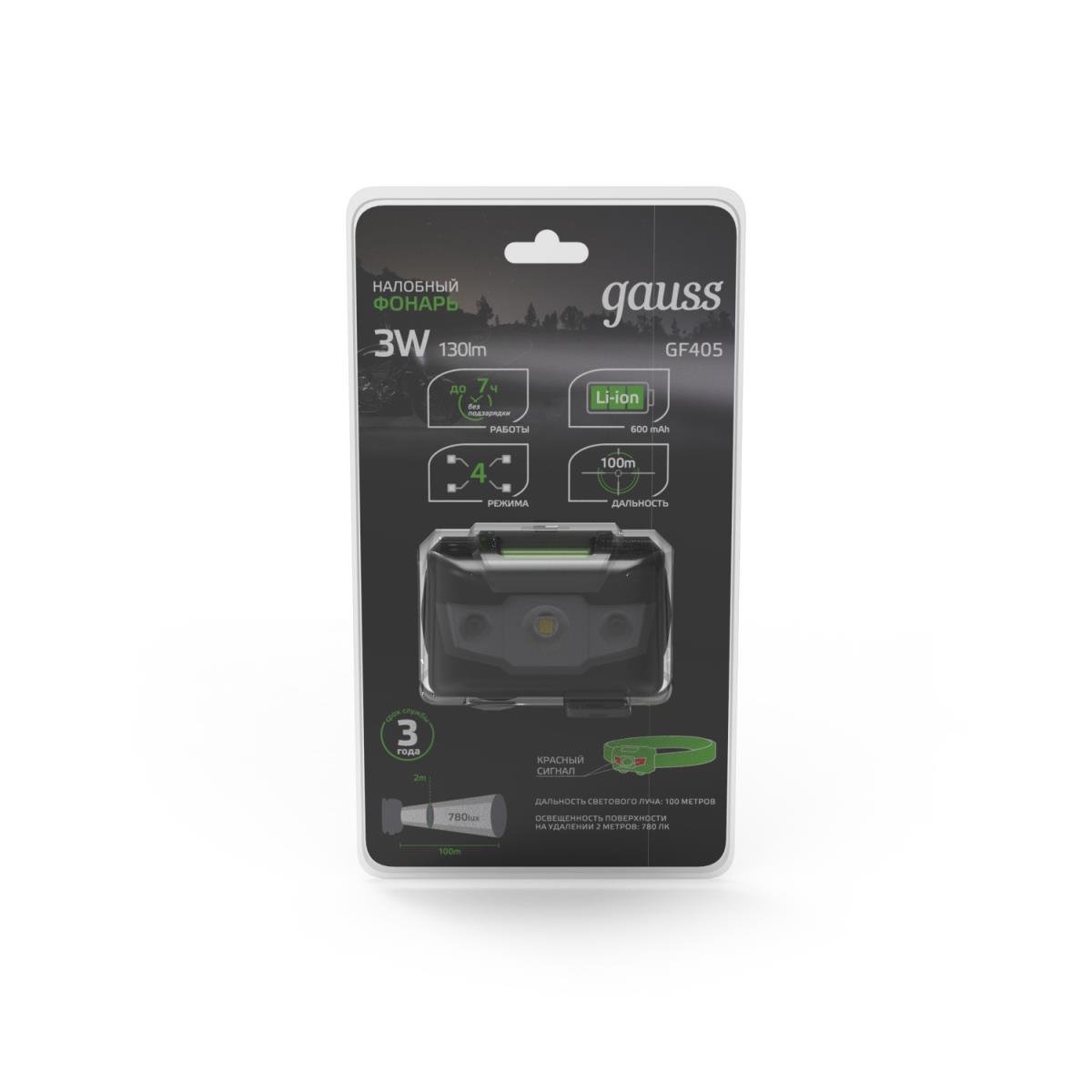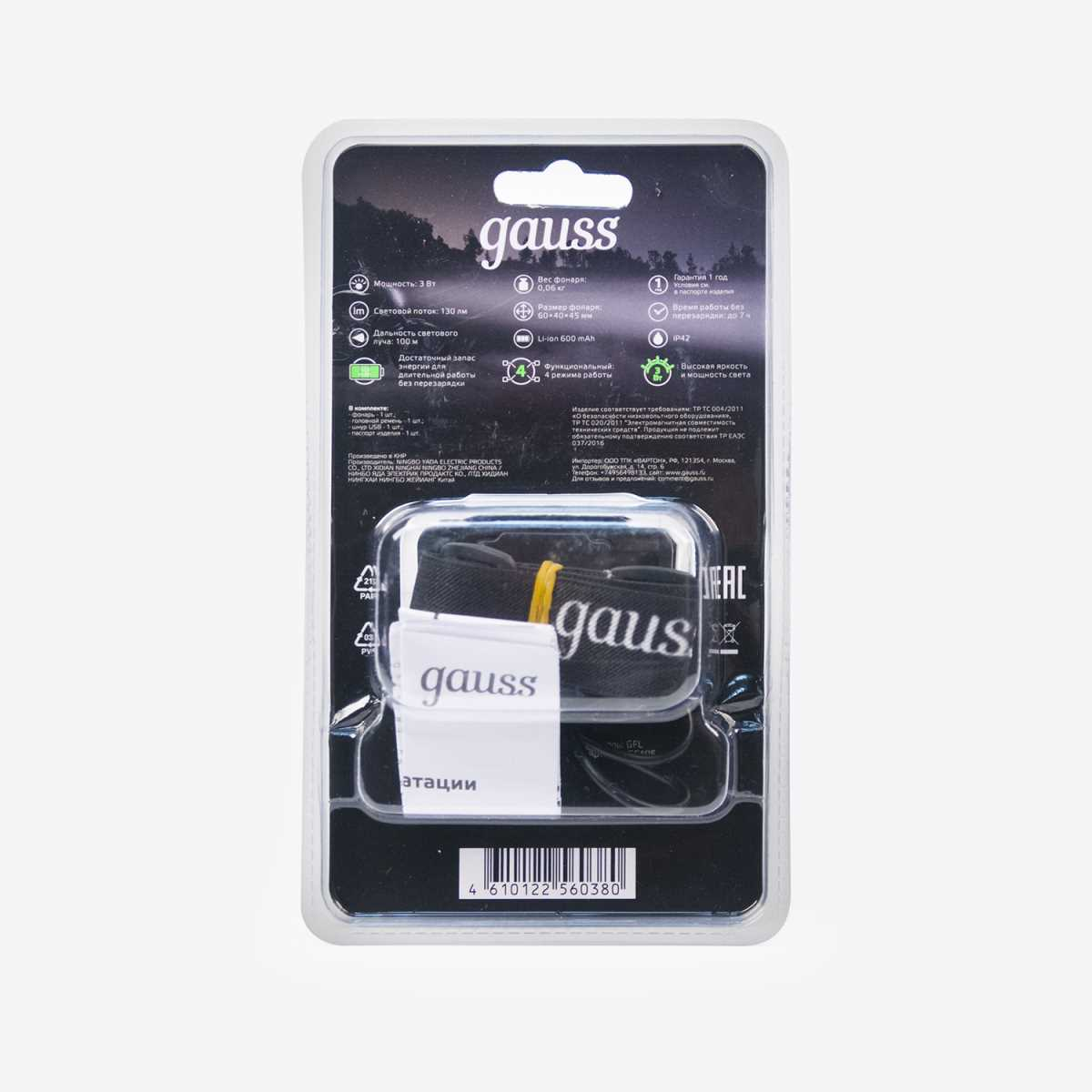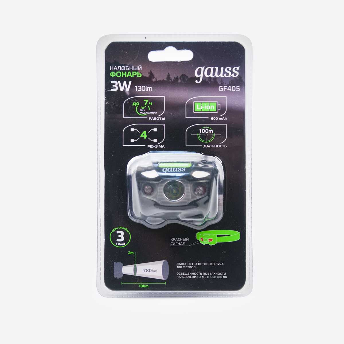 Налобный светодиодный фонарь Gauss аккумуляторный 40х60 130 лм GF405
