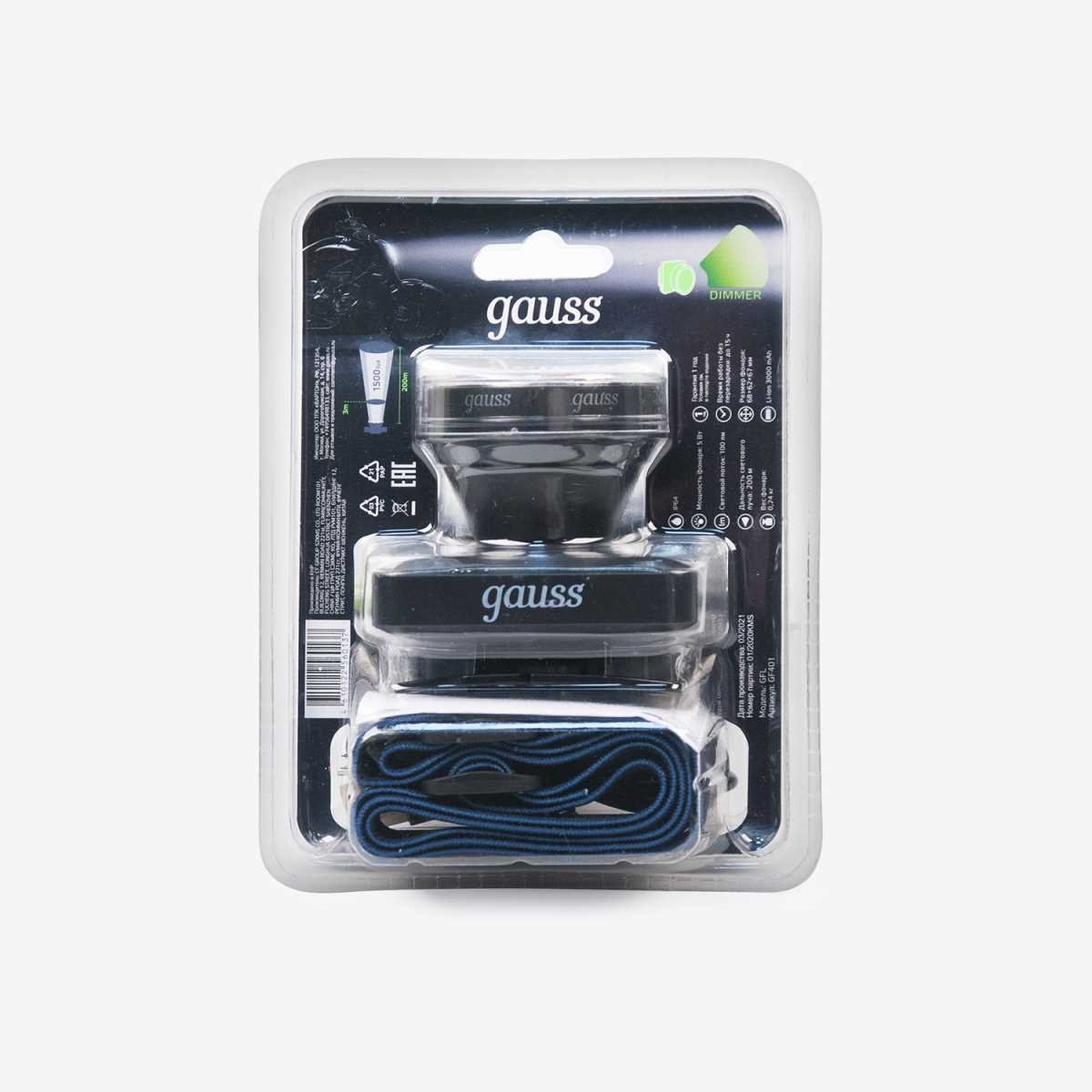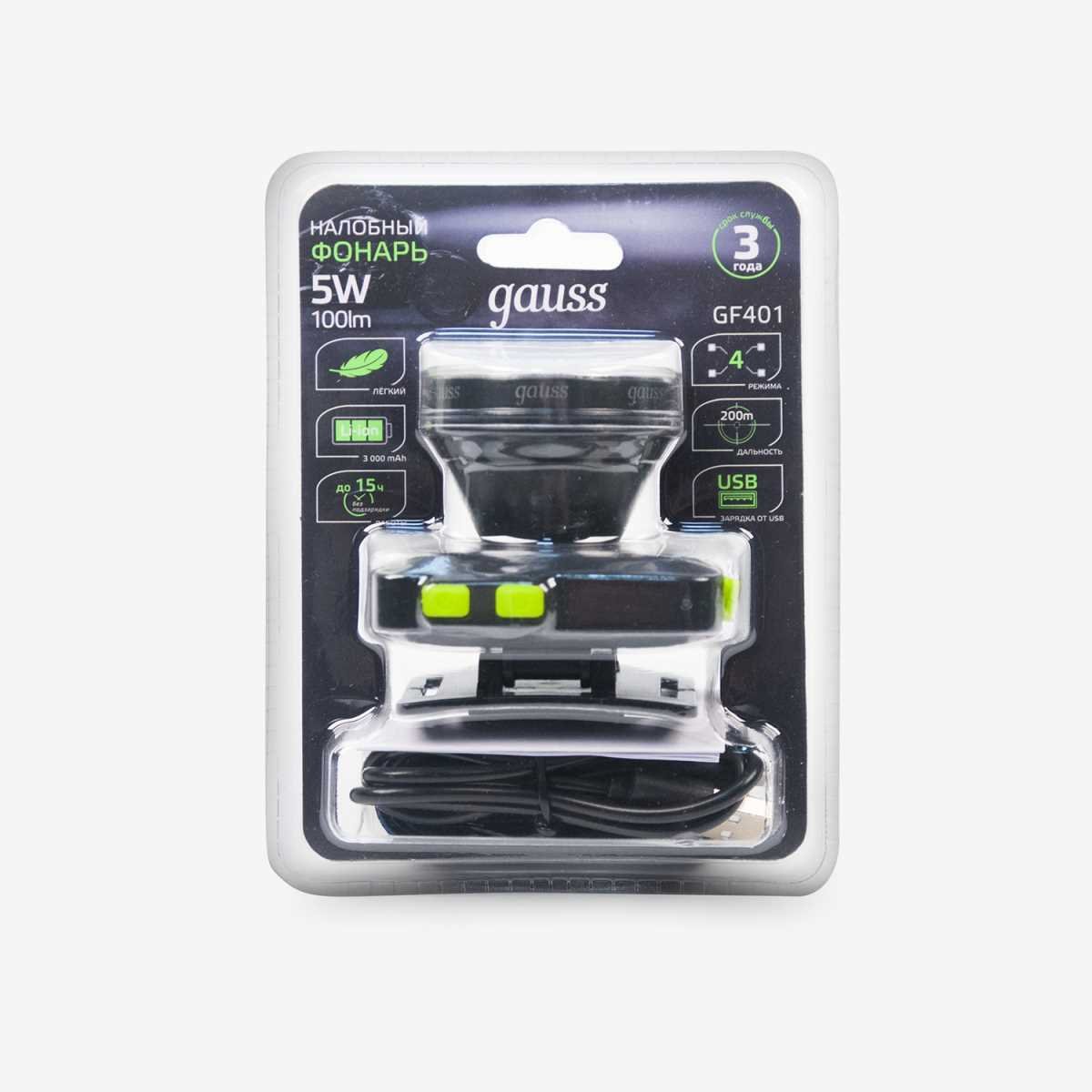 Налобный светодиодный фонарь Gauss аккумуляторный 60х70 100 лм GF401